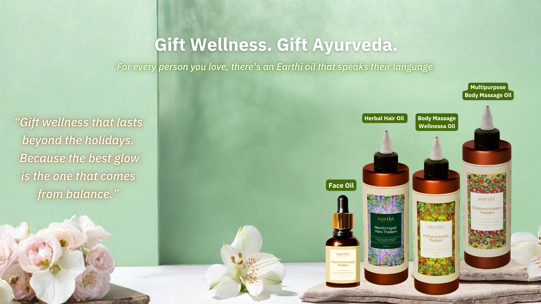 Discover the foundation of everyday Ayurveda with Earthi’s four oils — Neelibringadi Hair Oil, Pure Kumkumadi Saffron Face Oil, Dhanwantharam Body Oil, and Mahanarayana Massage Oil. Crafted from traditional Ayurvedic texts, these oils form a complete, holistic self-care system for hair health, glowing skin, daily Abhyanga, and deep anti-inflammatory relief.