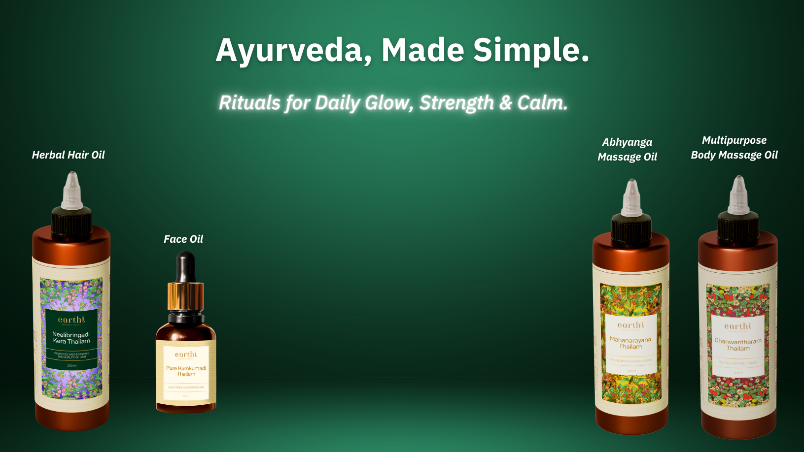 Healthy aging is not a serum—it is a ritual. Earthi’s four foundational Ayurvedic oils deliver everything your skin, hair and body need to glow naturally: